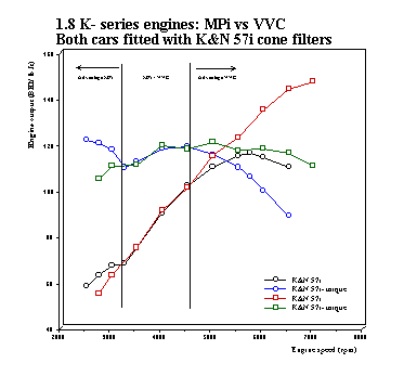 are quite revealing. Below 3,250 rpm, the 1.8i actually produces more power and torque than does the VVC. Perhaps this goes some way to explain why the latter car has the lower overall gearing? Between 3,250 and 4,750 the two cars are almost perfectly matched; the power and torque curves are practically super imposed upon each other. Above 4,750 rpm, the VVC starts to really stamp its authority, ultimately going on to produce close to 150 bhp at the rev limiter compared to a mere 120 bhp @ 5,750 rpm for the 1.8i. [All power figures quoted are at the road wheels; for a fly wheel estimate, add approx. 8 bhp] How often do you use the upper part of the rev range on your car? Not very often is the answer, which means that in every day use, the two cars are very evenly matched. |
