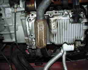 Flexi-pipe passes under the engine sump, connecting the exhaust manifold to the catalyst. |