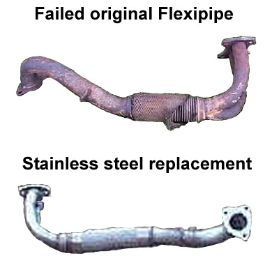 Damaged flexi-pipe (top) showing failure of the woven steel shield. One option is to replace it with a stainless steel item (pictured, bottom). |